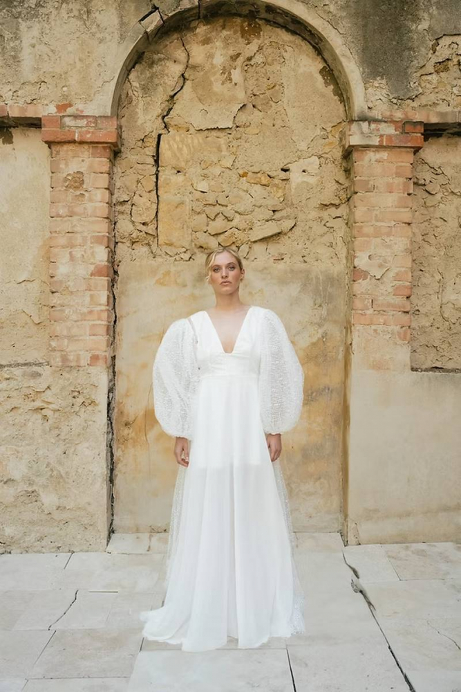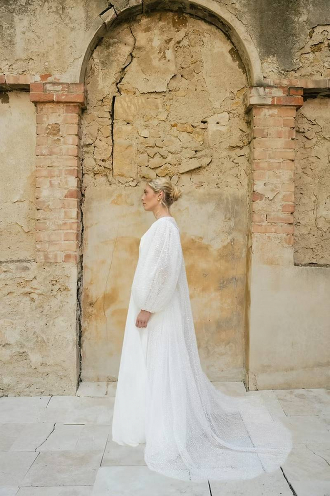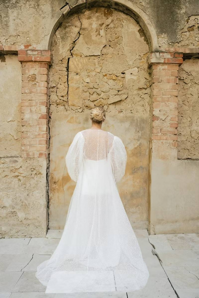L’incontournable Blanche peut être sublimée par le Par-dessus Blanche, dont les manches longues ballon XXL insufflent sophistication et présence. Sa traîne en tulle plumetis vient compléter la tenue avec une touche féerique, pour un effet 100 % neige, idéal pour une mariée tout en grâce et modernité.