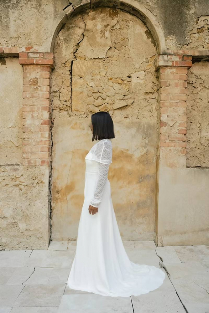La coupe ajustée en crêpe de soie épouse les formes avec grâce, tandis que sa traîne arrondie accompagne les mouvements avec fluidité.
