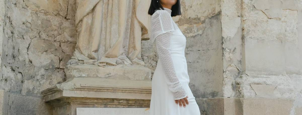 L’incontournable Elisabeth peut être sublimée par le Par-dessus Elisabeth en dentelle, dont la coupe délicate, le col montant et la rangée de boutons dans le dos renforcent son élégance naturelle.