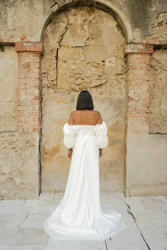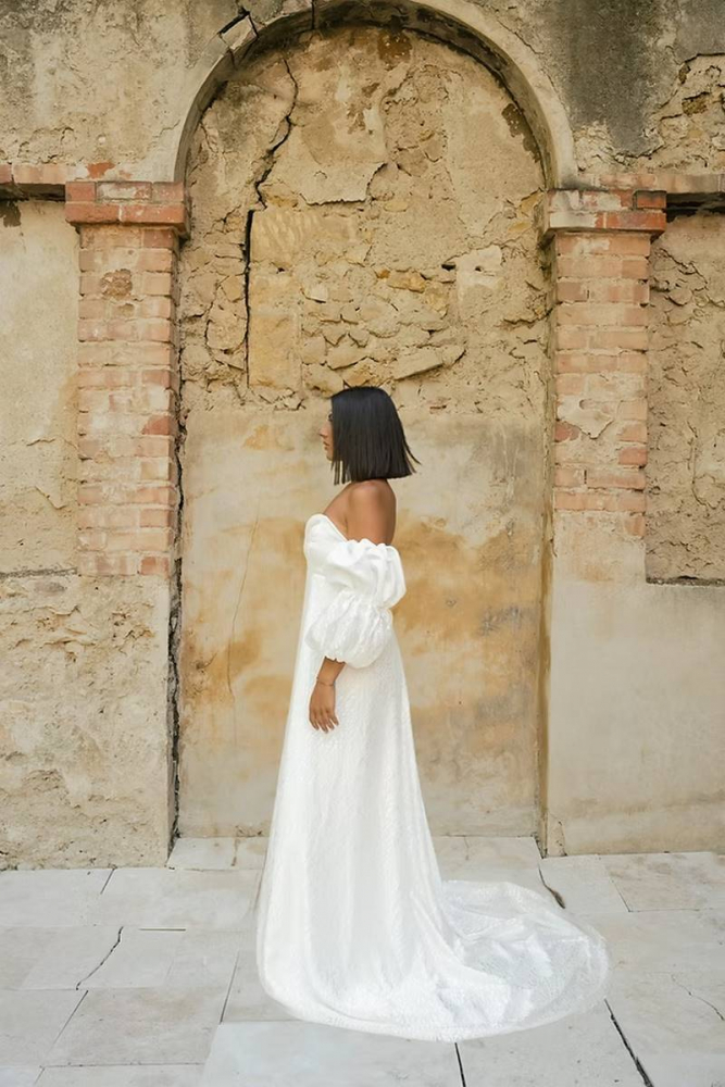 La robe Heather est pensée pour la mariée romantique et sophistiquée, en quête d’un équilibre entre douceur et caractère. Ce look ultra glamour dessine une silhouette affirmée, portée par une allure élégante et sensuelle. Son tombé droit épouse délicatement les lignes du corps sans les dévoiler, tandis que sa longueur généreuse et sa traîne XXL accompagnent chaque pas avec fluidité.