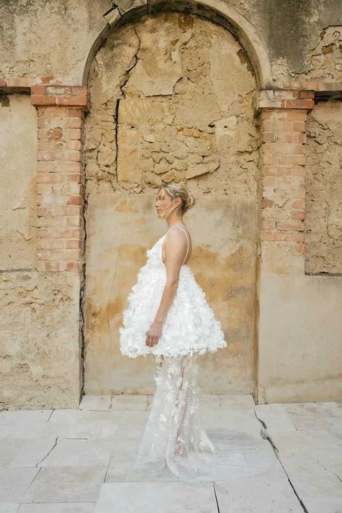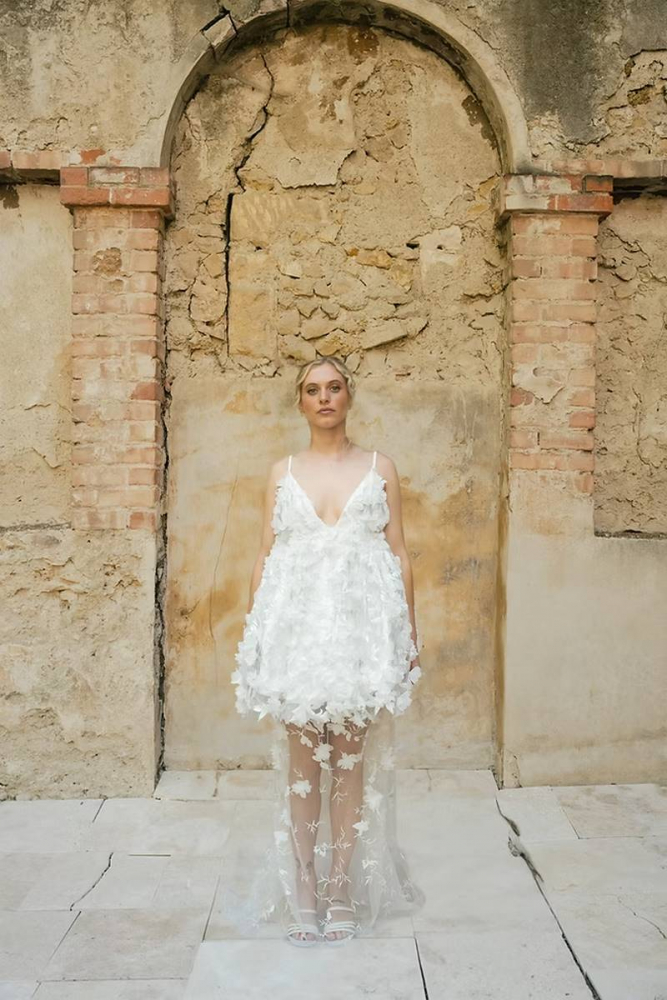 La robe Jodie s’adresse à la mariée affranchie et joueuse, avec un style à la fois féminin, romantique et plein de fraîcheur. Inspirée des années 1960, sa coupe Baby Doll, ornée de fleurs 3D, crée une silhouette aérienne et innocente.