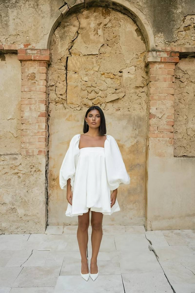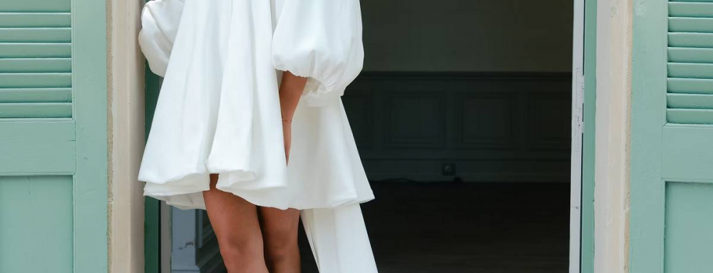 La longueur mini, associée à un volume maxi, crée un contraste saisissant qui attire tous les regards. La sobriété du crêpe de soie vient équilibrer cette silhouette forte, lui insufflant douceur et pureté.