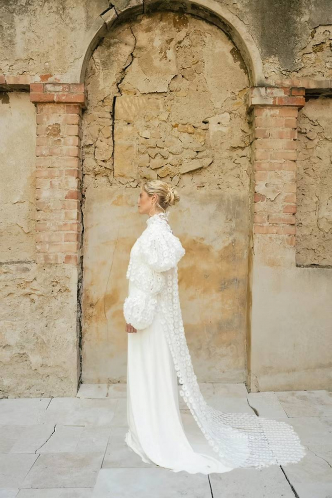 Le col montant évoque l’élégance victorienne, le haut façon tee-shirt apporte modernité, et le dos décolleté ajoute une touche de sensualité. Sa traîne brodée de soleils 3D illumine la silhouette d’une aura poétique et lumineuse.
