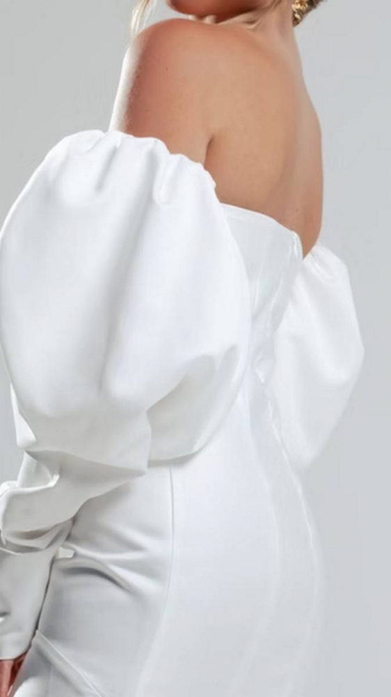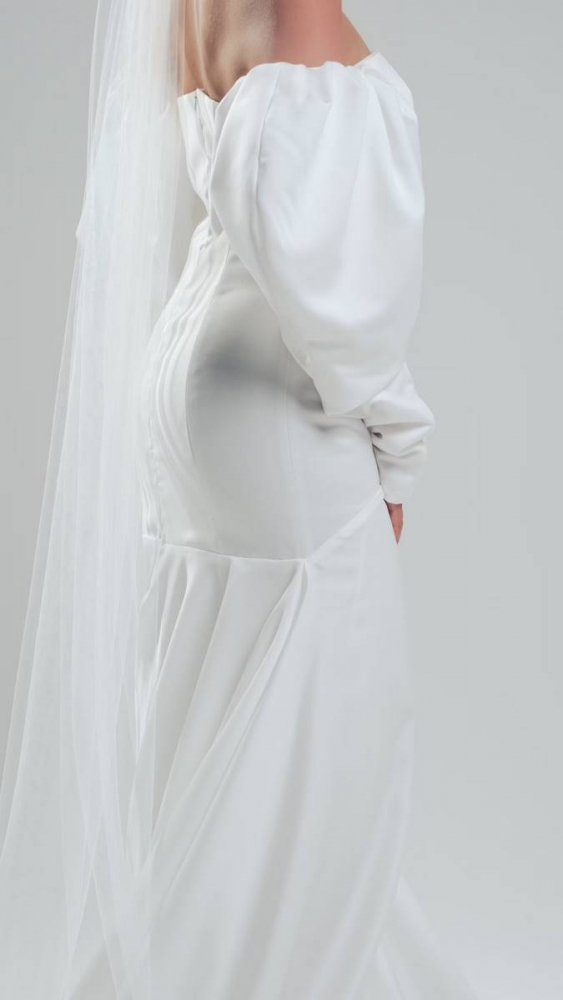 Robe goutte en satin duchesse blanc uni, au tombé structuré et élégant. Le bustier ajusté épouse le corps jusqu’aux hanches, mettant en valeur la silhouette avec justesse.