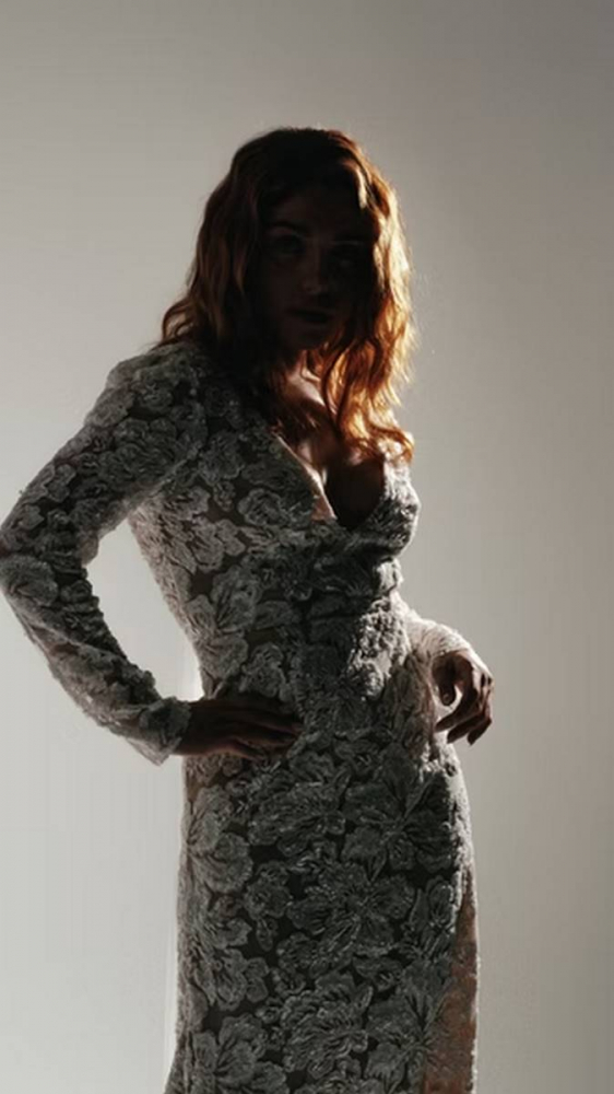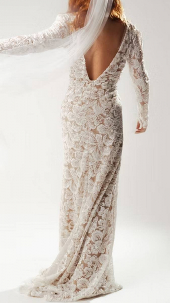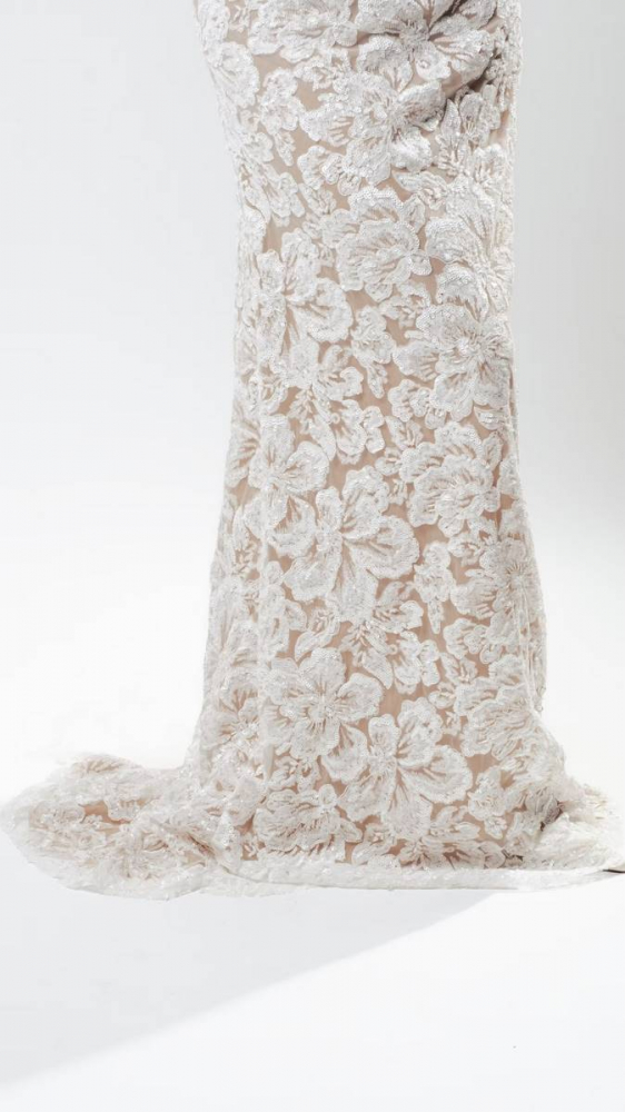 Robe de mariée en tulle brodé de perles et sequins, ornée d’un motif floral délicat et doublée d’une maille couleur chair pour souligner la transparence tout en douceur. Le décolleté en V, à l’avant comme dans le dos, met en valeur la silhouette avec subtilité. La coupe cintrée épouse le corps, tandis que le bas ajusté, agrémenté d’une quille et de godets, apporte fluidité et élégance au mouvement. Les manches longues ajustées jouent avec la transparence pour un rendu raffiné. Une création qui conjugue avec justesse glamour, audace et sophistication, pensée pour une mariée sûre d’elle et résolument moderne.