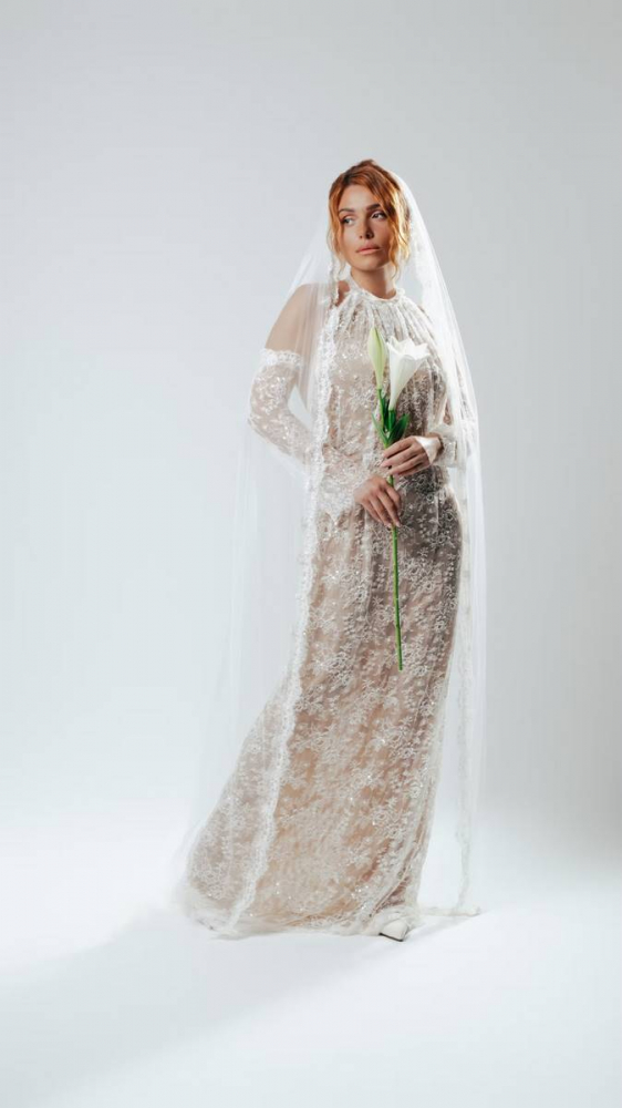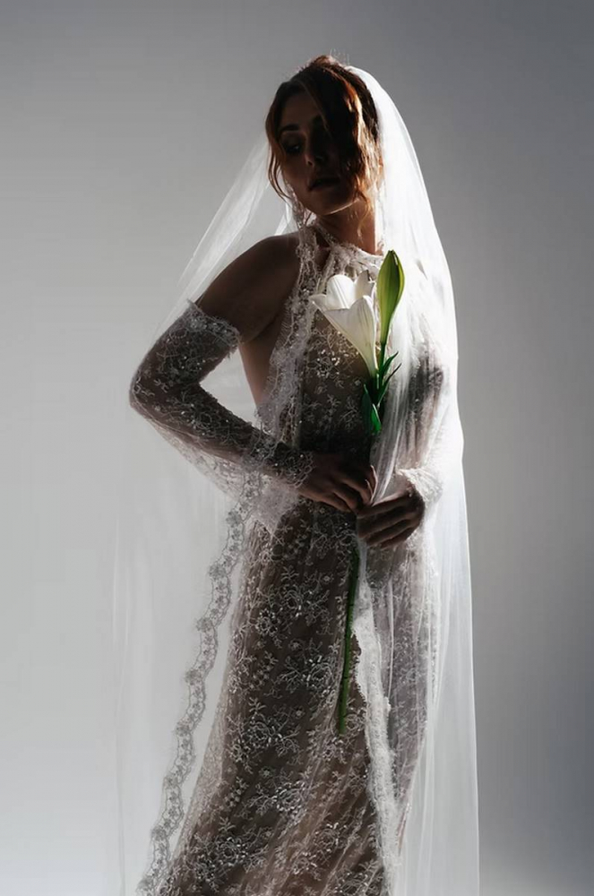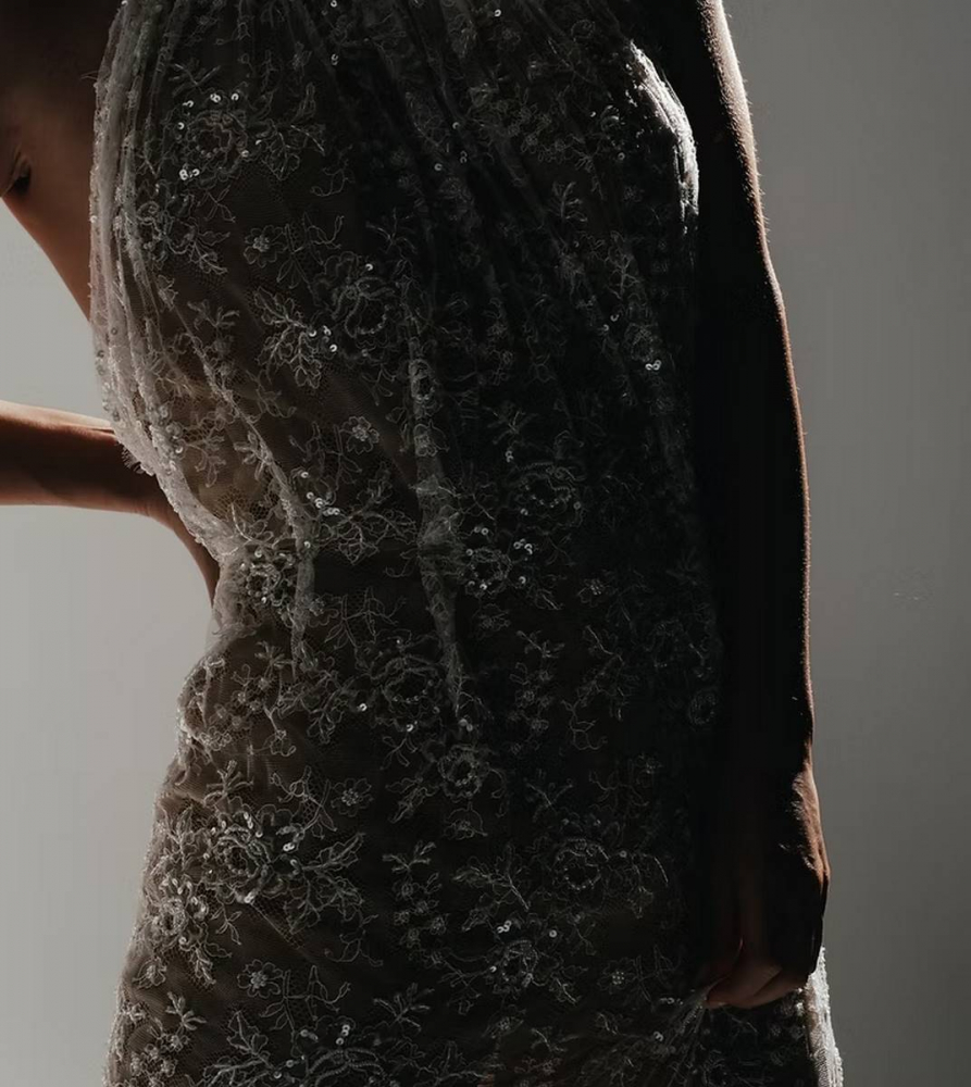 Robe de mariée en dentelle de Calais au motif floral, rehaussée de sequins et de perles de verre pour une brillance subtile. Entièrement doublée d’une maille couleur chair opaque, elle met en valeur la finesse de la dentelle.