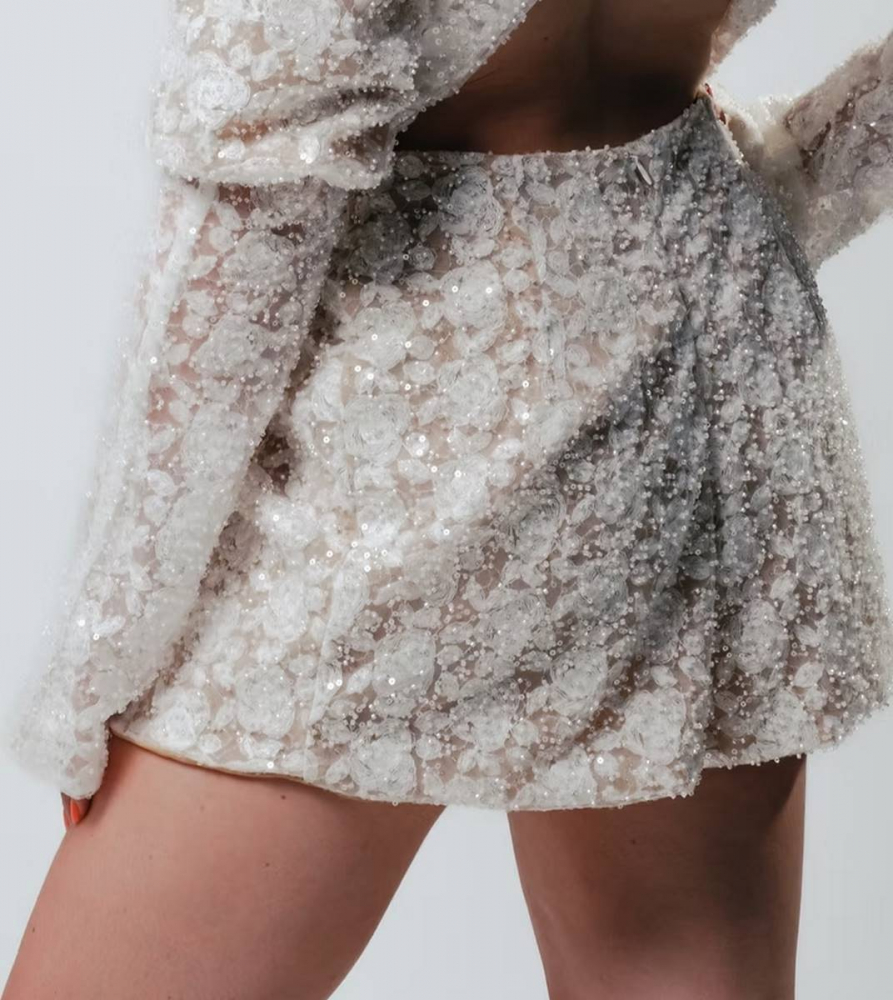Combinaison short en tulle brodé de perles et sequins, mettant en valeur un motif floral délicat et scintillant. L’emmanchure américaine plissée structure le haut et souligne les épaules, tandis que la coupe est cintrée à la taille pour dessiner la silhouette.